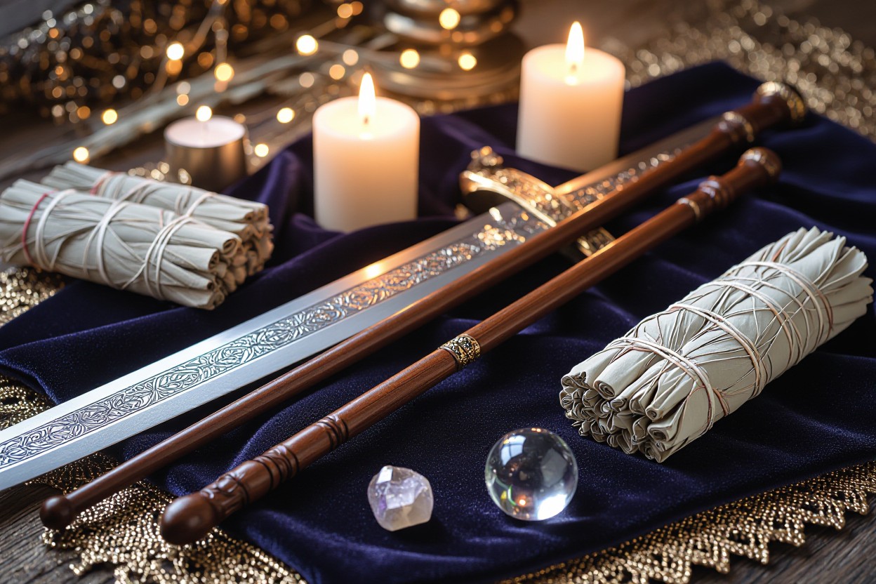 - Bacchette e spade/athame: bacchette in legni specifici per direzione e invocazione, spade/athame per «taglio» energetico e delimitazione; come realizzarle (scelta del legno/metallo, incisioni, oliatura), consacrazione e differenze d’uso nelle pratiche evocative.